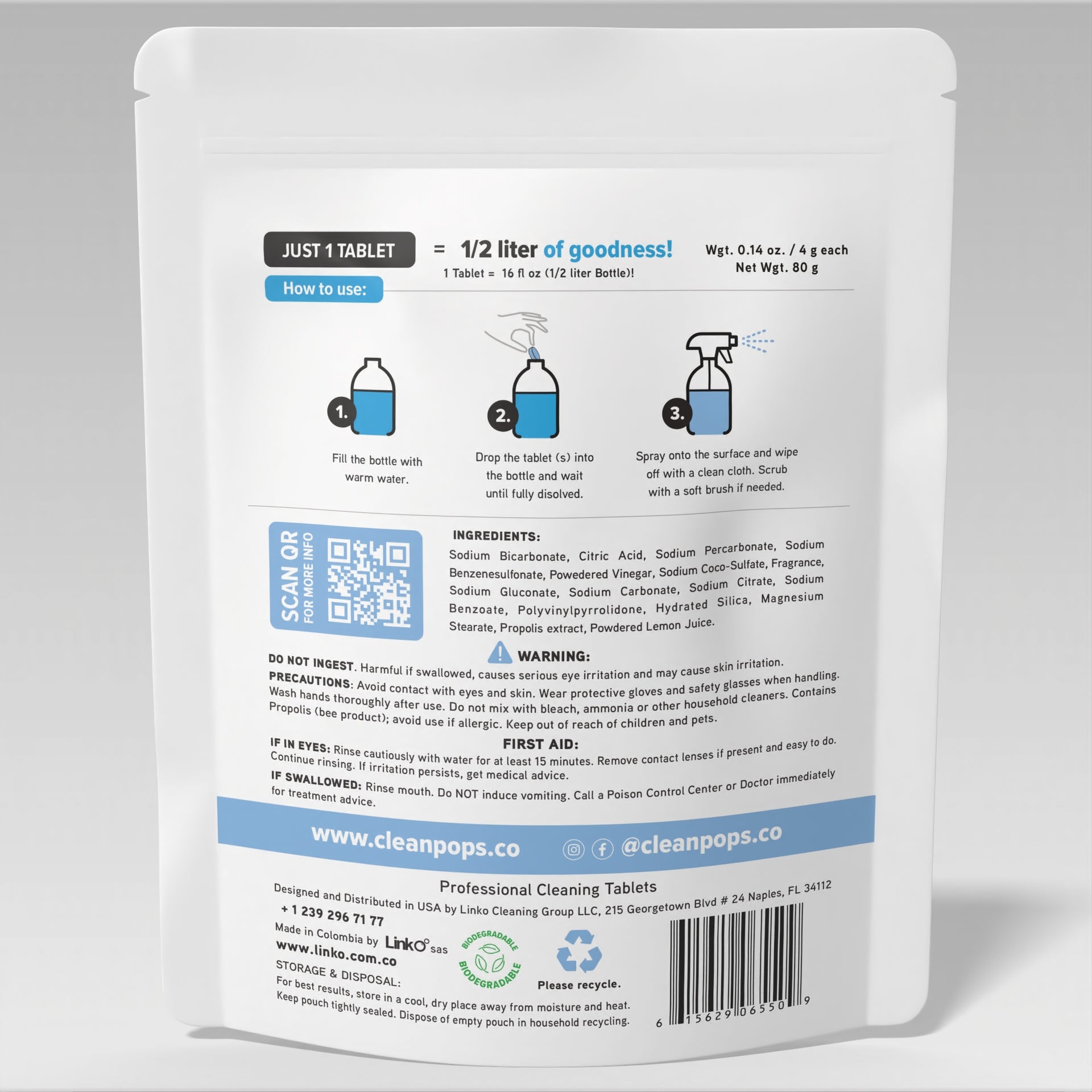 Transform your bathroom into a sparkling clean, fresh-smelling space with Cleanpops Bathroom Cleaner Tablets. Powered by vinegar and enhanced with our unique Cielito fragrance, these tablets dissolve tough bathroom grime, soap scum, and limescale—leaving showers, sinks, tubs, tiles, and toilets spotless. Each pouch of 20 tablets delivers professional-strength cleaning while saving space, money, and plastic waste.