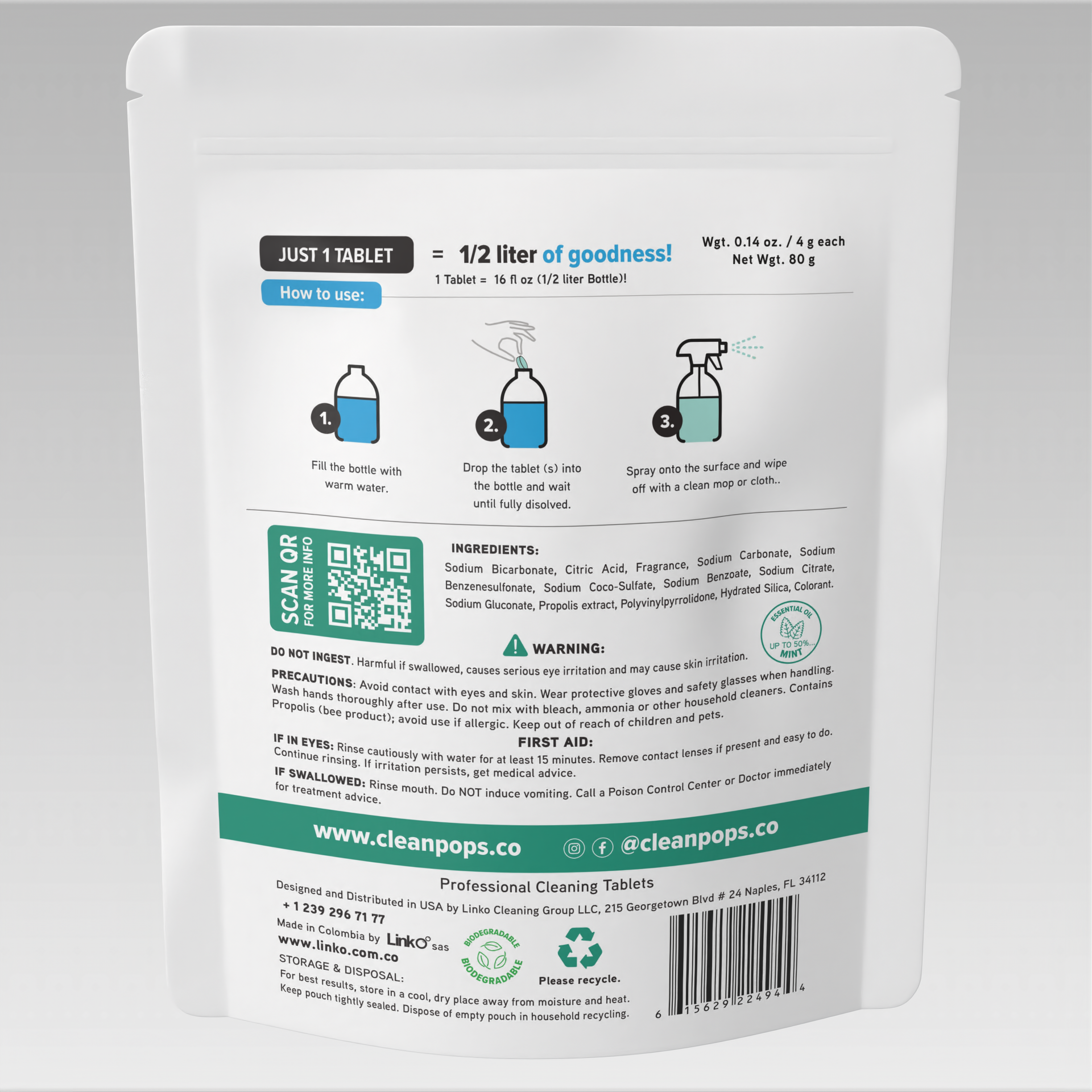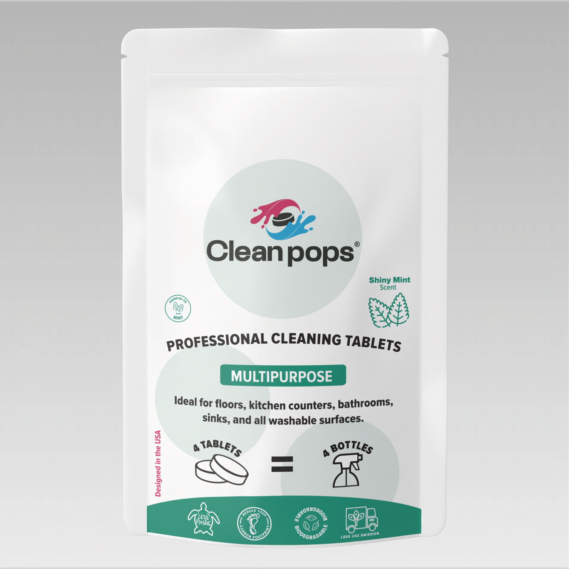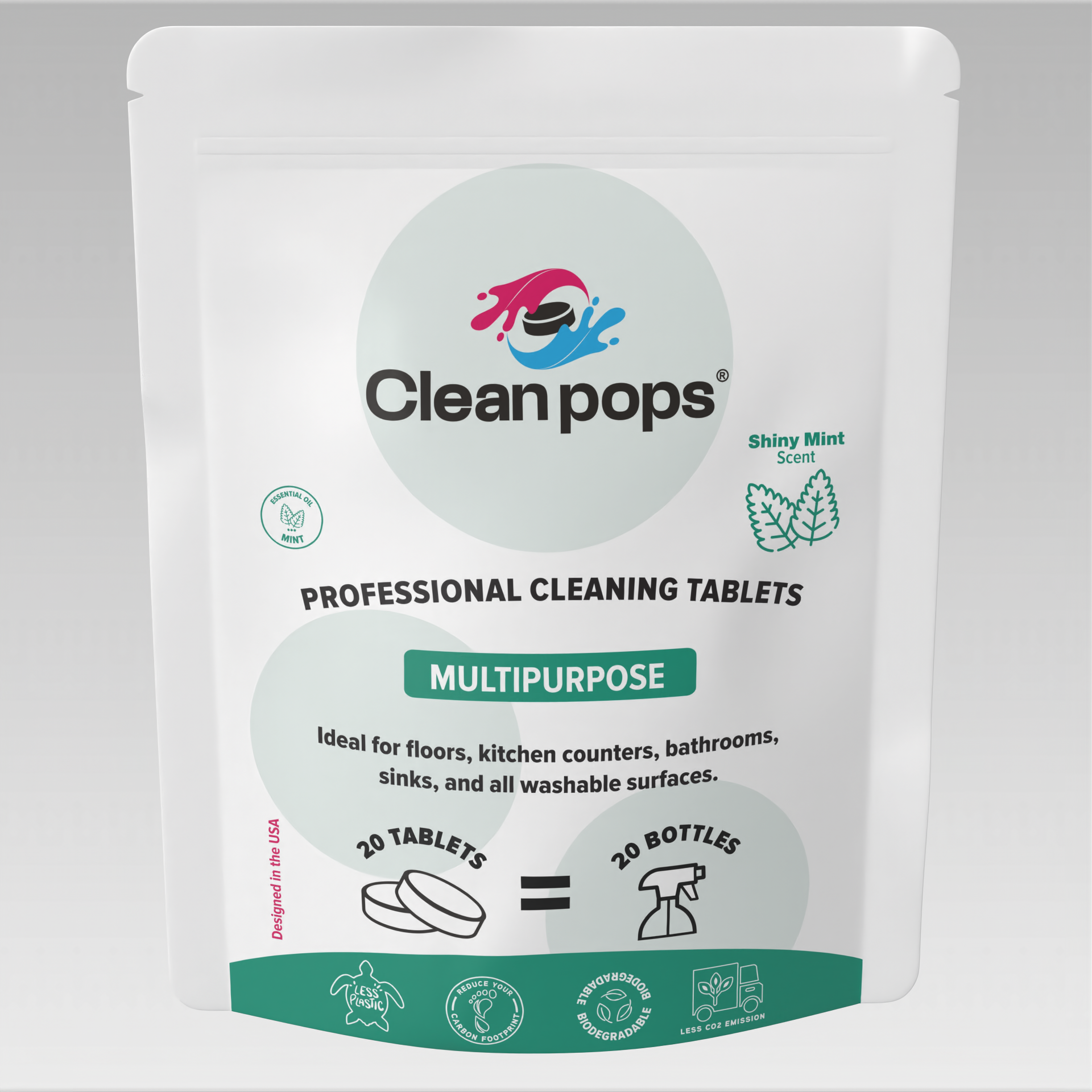 Refresh your home with the crisp, cooling scent of mint while enjoying powerful, eco-friendly cleaning. Cleanpops Multipurpose Cleaner Tablets – Shiny Mint Scent dissolve tough dirt and grease on multiple surfaces, leaving behind a streak-free shine and invigorating freshness. Perfect for floors, countertops, sinks, bathrooms, and all washable surfaces, this 20-tablet pouch is designed for both homes and professional cleaning teams.